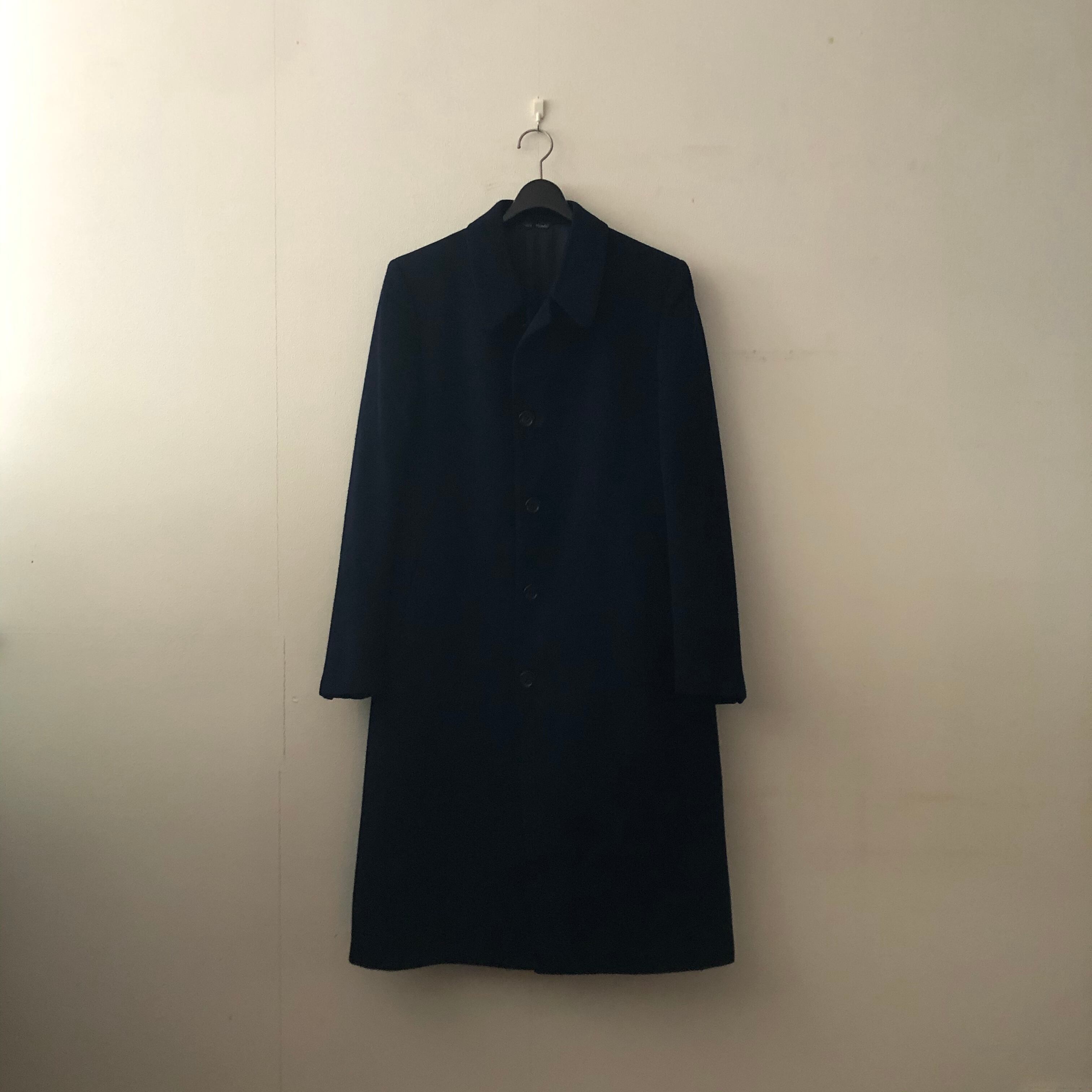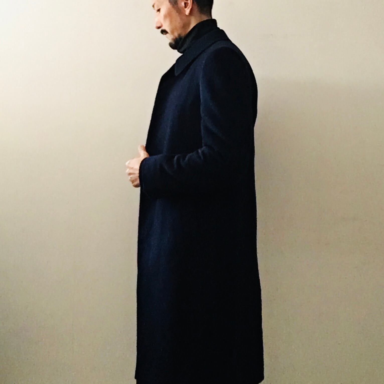 ネイビーのロング丈でも重たく見えないのは、少しシェープの効いたラインのおかげ
